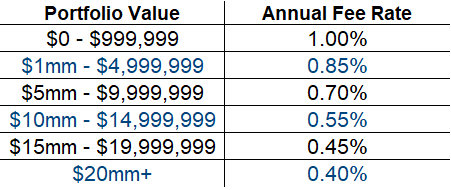 Example: If Onyx is managing $2mm of your assets, the entire $2mm will have a fee of 0.85% instead of the first $999,999 having a fee of 1.00% and the remainder having a fee of 0.85%.